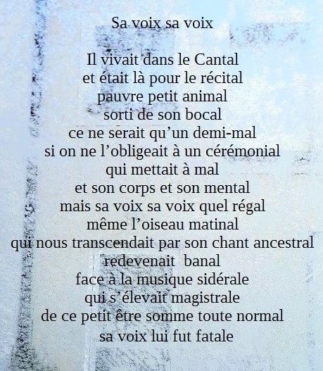 sa voix sa voix Publié le 25 janvier 2018 par reinette pour la rime imposée de Violettehttps://wrviolette.blogspot.fr/2018/ Publicité